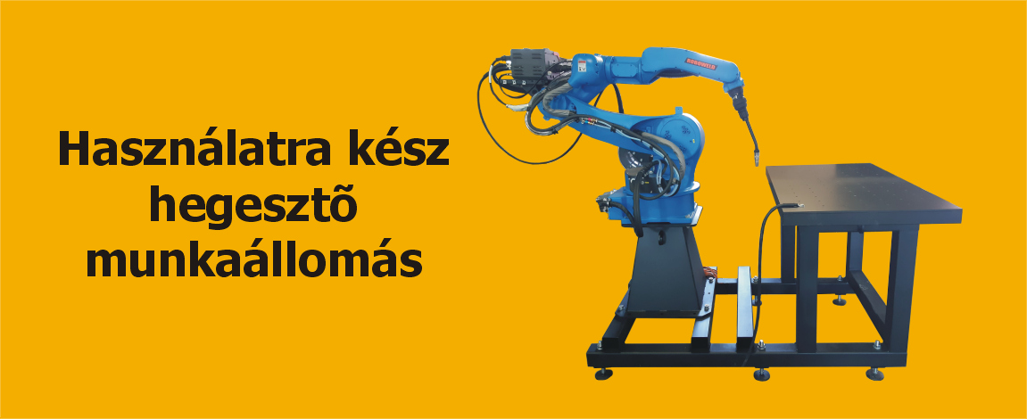 Egyszerű robot munkaállomás. Erős és merev hegesztett vázszerkezet. Az asztalon 100x100mm-es osztású M10-es menetek a munkadarab rögzítők felfogatásához. A munkaasztal teljes felületét eléri a robotkar.